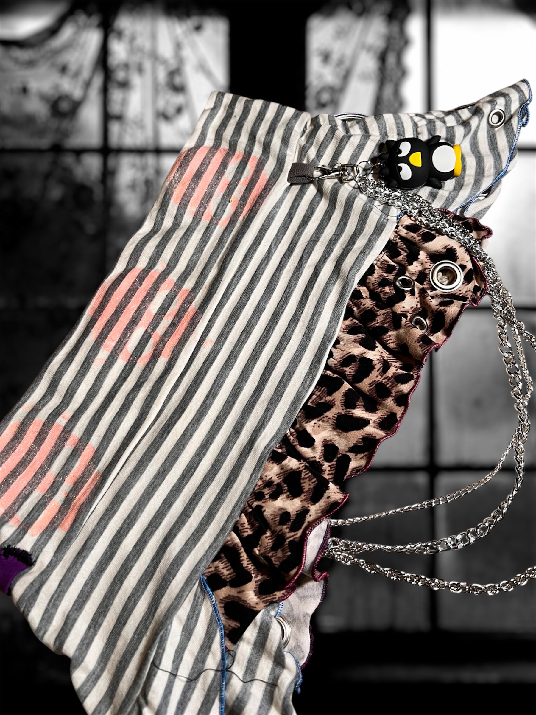 handmade baby micro skirt with painted pink skulls, grommet detail, detachable chain, and Sanrio pin.